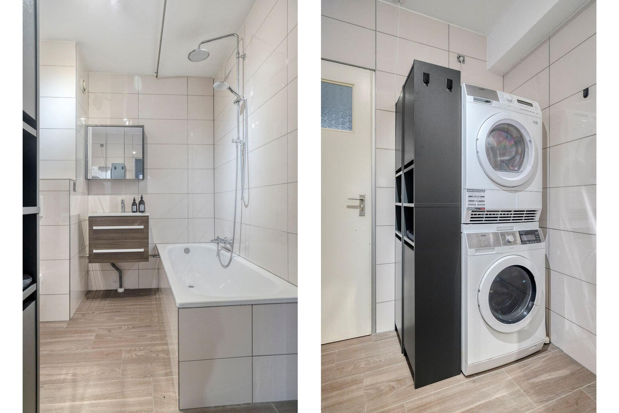 De net betegelde badkamer (2016) is voorzien van een ligbad, wastafelmeubel, toilet en wasmachine-aansluiting.