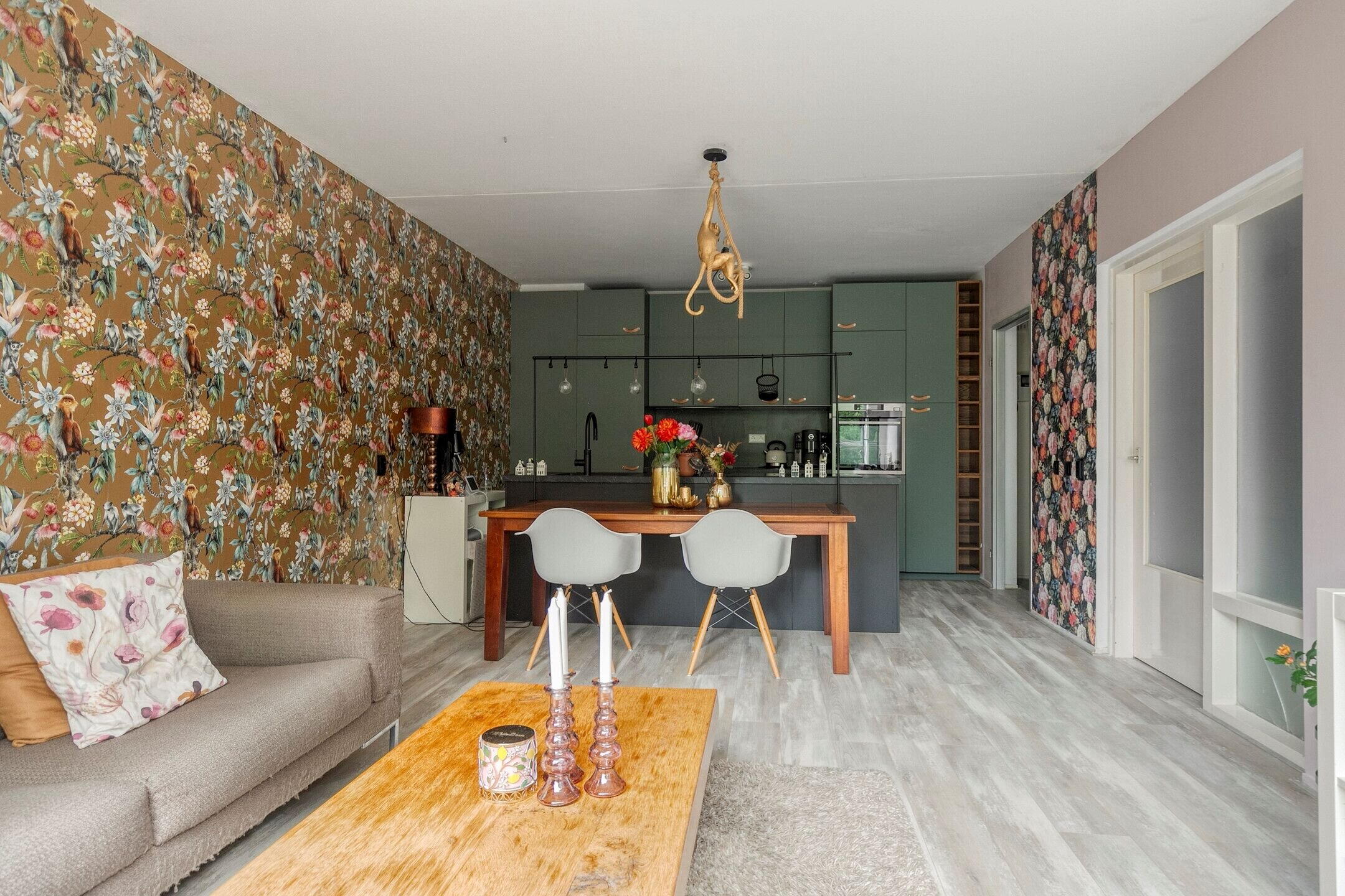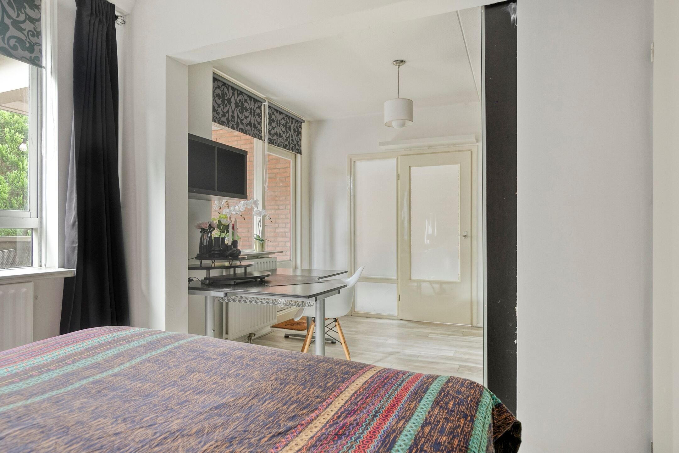 The living room is beautifully situated with a lovely unobstructed view of the park. Each season offers a different atmosphere. Here you can comfortably sit and there's room for a dining table. The windows will soon be replaced with new frames and HR++ glazing. This will also improve the energy rating and reduce heating costs. The walls were smoothly plastered in 2021.